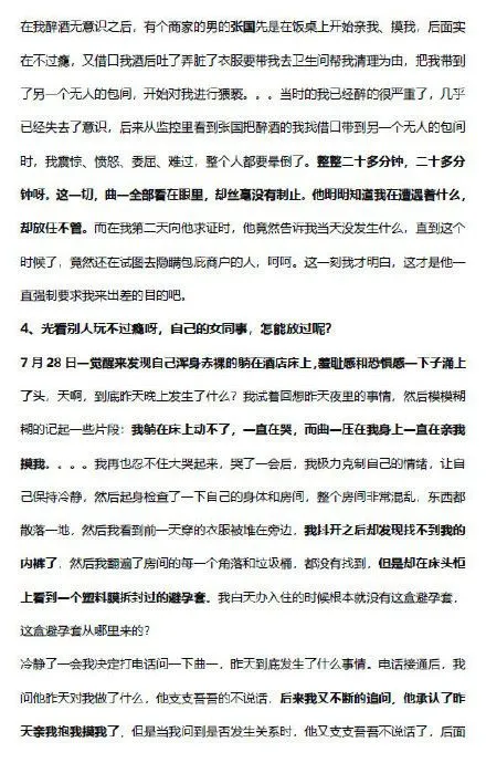 8 月 7 日晚,網(wǎng)傳阿里巴巴一名女員工發(fā)表一篇約 8000 字的長(zhǎng)文,詳細(xì)描述了其于 7 月 27 日,被其領(lǐng)導(dǎo)(花名曲一)逼迫去濟(jì)南出差,然后被灌醉性侵的詳情。