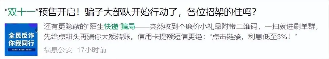 雙十一期間快遞多,大家容易混淆信息,正好給了騙子可乘之機(jī)。建議大家及時(shí)下載 “國家反詐中心” APP,了解最新騙局;遇到可疑情況,第一時(shí)間撥打 96110反詐專線咨詢,別讓血汗錢成了騙子的 “雙十一紅包”!