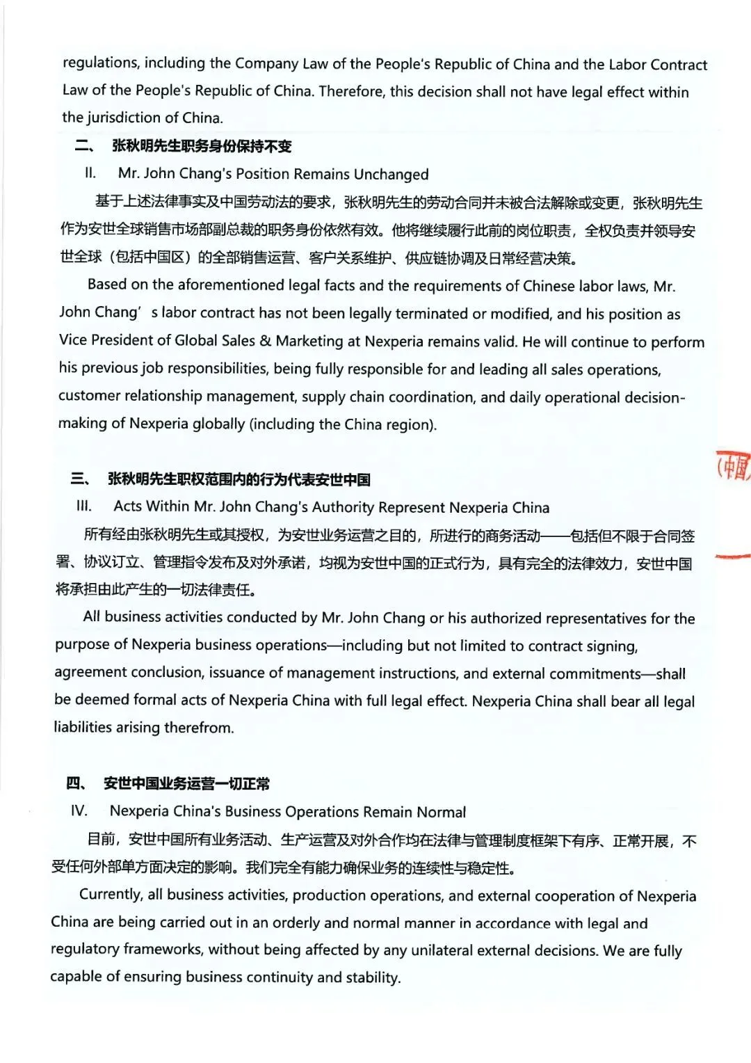 安世中國:荷蘭總部免職決定在中國境內無法律效力