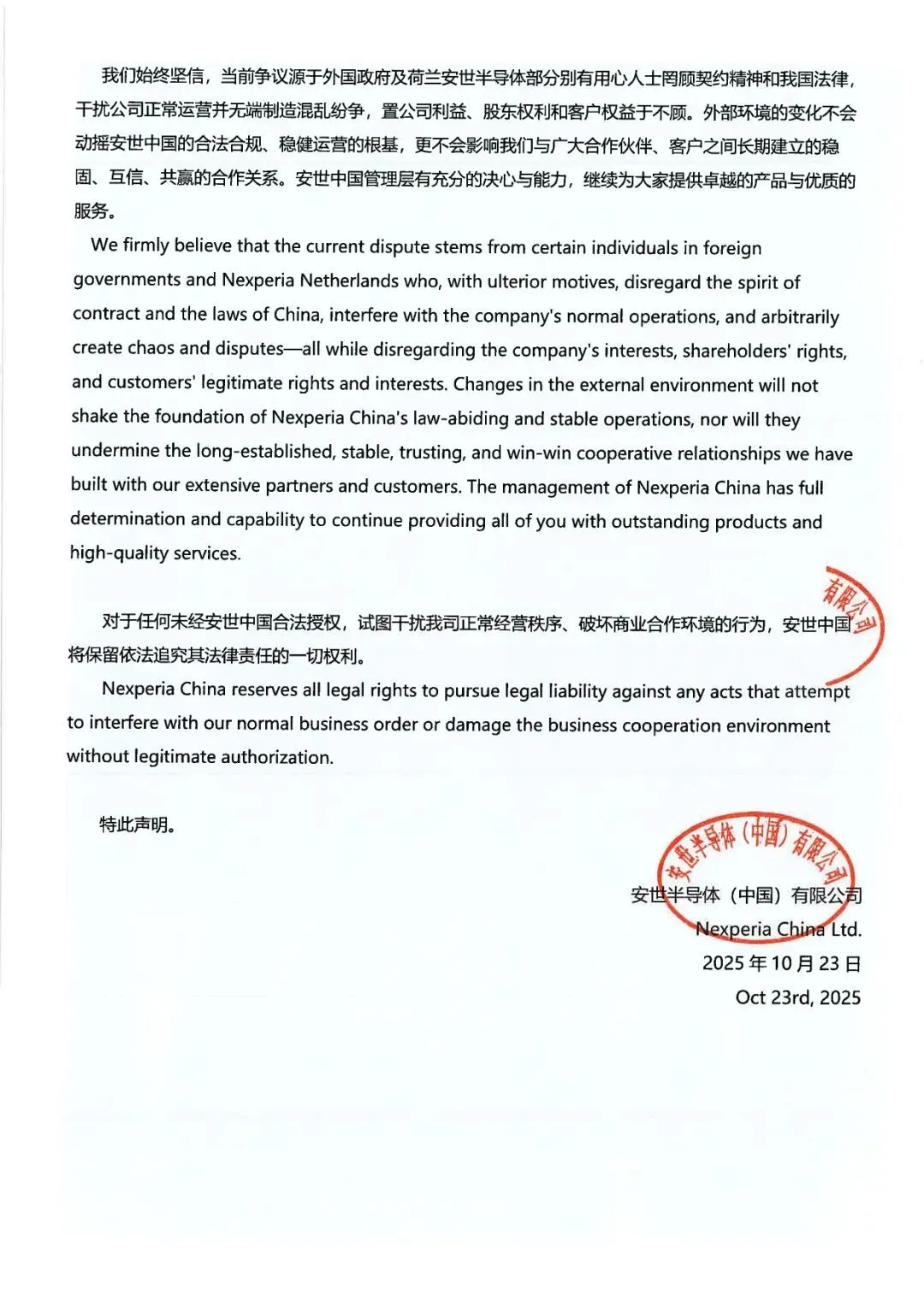 鳳凰網科技訊 10月23日,安世半導體中國有限公司公眾號消息,安世半導體(中國)有限公司現就近期荷蘭總部單方面免去張秋明先生銷售市場部副總裁職務一事,發(fā)表如下正式聲明: