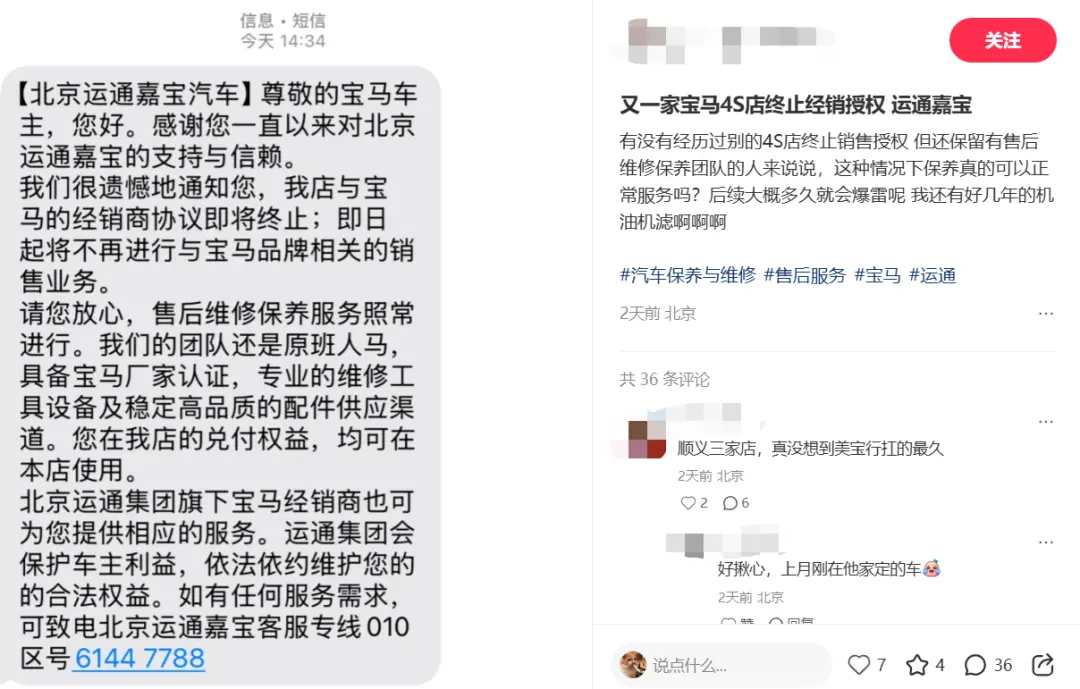 近日,陸續(xù)有寶馬車主收到短信通知,稱北京運(yùn)通嘉寶、萬寶航旗下寶馬4S店被寶馬官方取消經(jīng)銷授權(quán)。